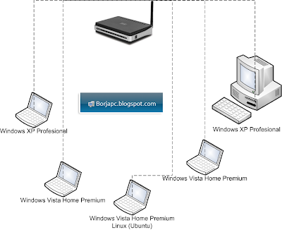 Dispongo de 4 Ordenadores portatiles y un sobremesa que se conectan mediante conexión Wifi, aquí os dejo un grafico creado con el Visio para mostrar mejor el tipo de conexión aunque no tiene demasiado que comprender..